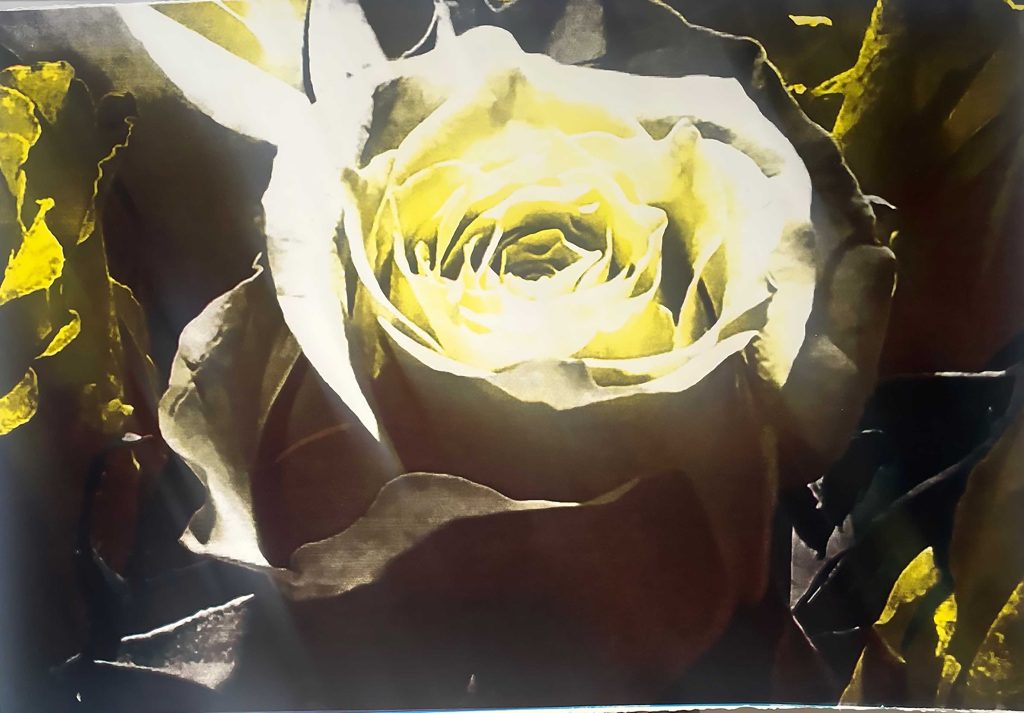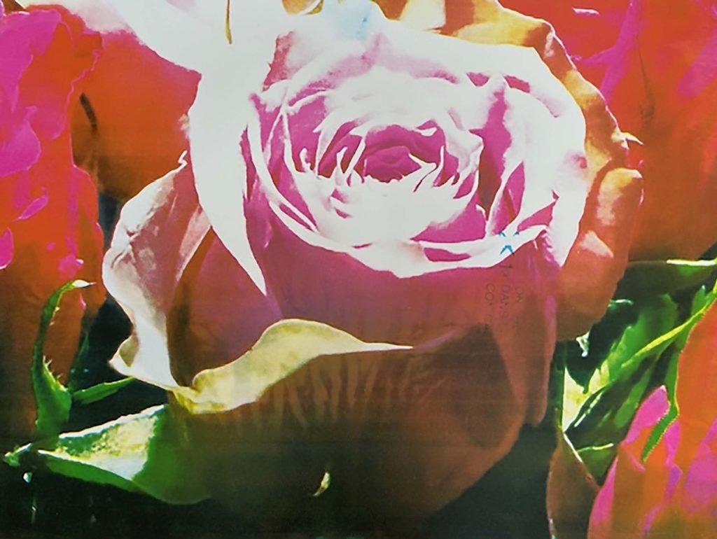 I am currently screenprinting a series of roses (Ancient Rose) some of which can be seen below. The photographs below are the pandemic rose screenprints – a small selection of the vast number taken and that are being sifted through.